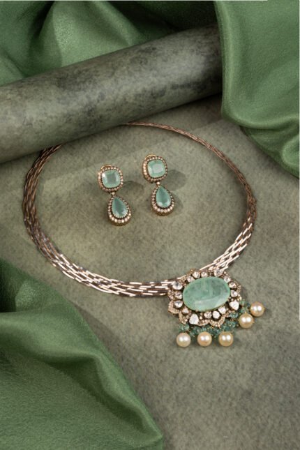 Oval Aqua Polki Pearl Drop Necklace Set