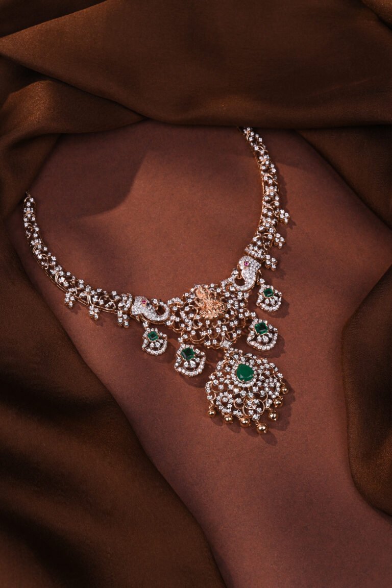 Designed with ornate medallion-style diamond settings, this necklace is elevated with emerald accents that add a touch of royalty. Its bold yet refined design makes it a perfect statement piece for weddings, receptions, and luxury soirées.