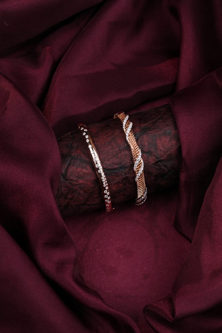 A modern twist on classic luxury, this bangle features interwoven gold patterns embellished with diamonds. Its sleek design makes it perfect for both festive wear and elegant evenings.