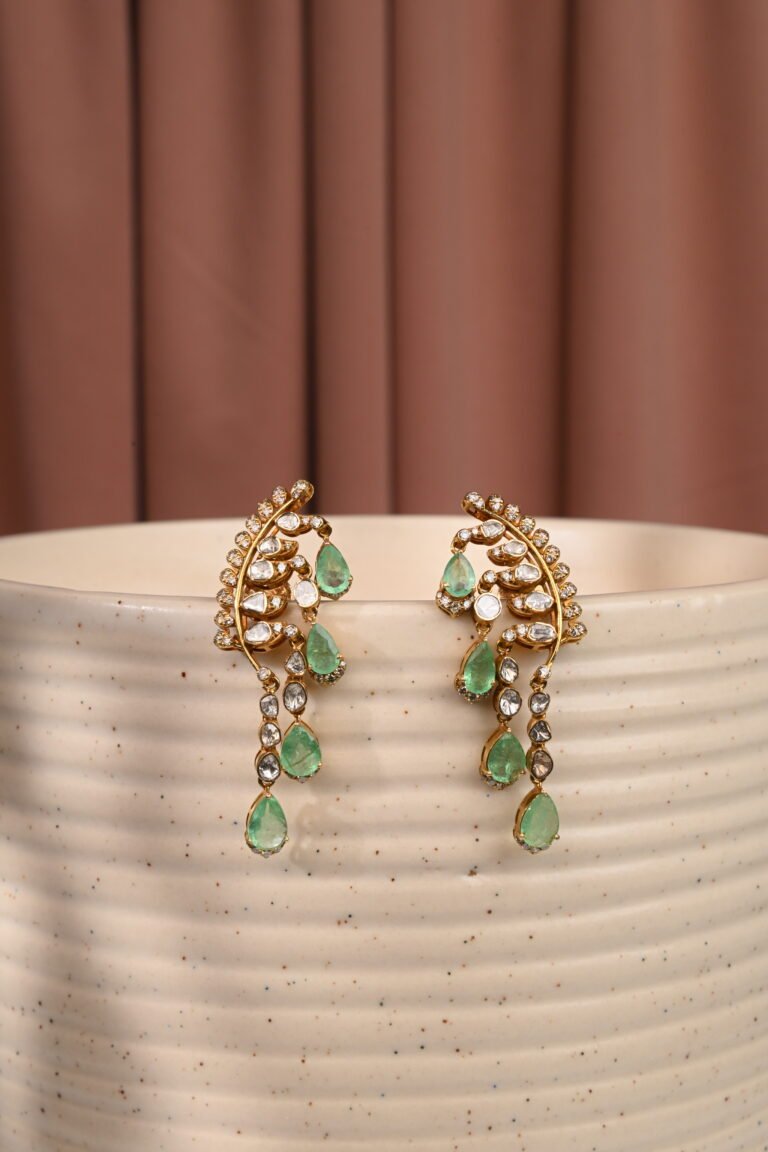 A modern take on classic polki jewelry, these cluster earrings showcase multiple uncut stones arranged in an intricate design. Chic yet traditional, they pair beautifully with both ethnic wear and contemporary outfits.
