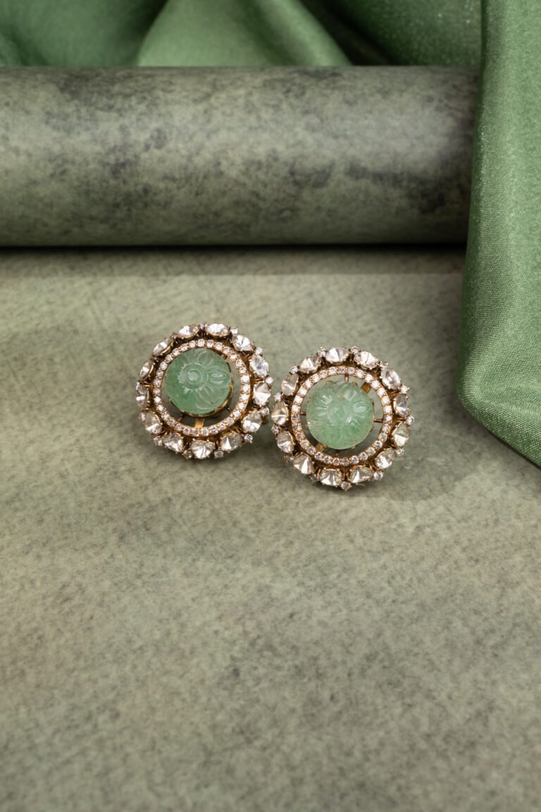 Elegant Polki stud earrings featuring carved emerald-green center stones framed by uncut polki diamonds. Designed in a classic halo silhouette, these earrings add refined sophistication to bridal, festive, and evening wear