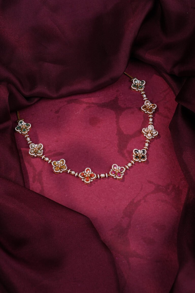 Inspired by timeless floral motifs, this heritage necklace features intricately designed flower elements highlighted with shimmering stones and subtle color accents. Lightweight yet luxurious, it’s perfect for festive celebrations, weddings, and elegant traditional styling. A refined piece that adds charm to every ensemble.