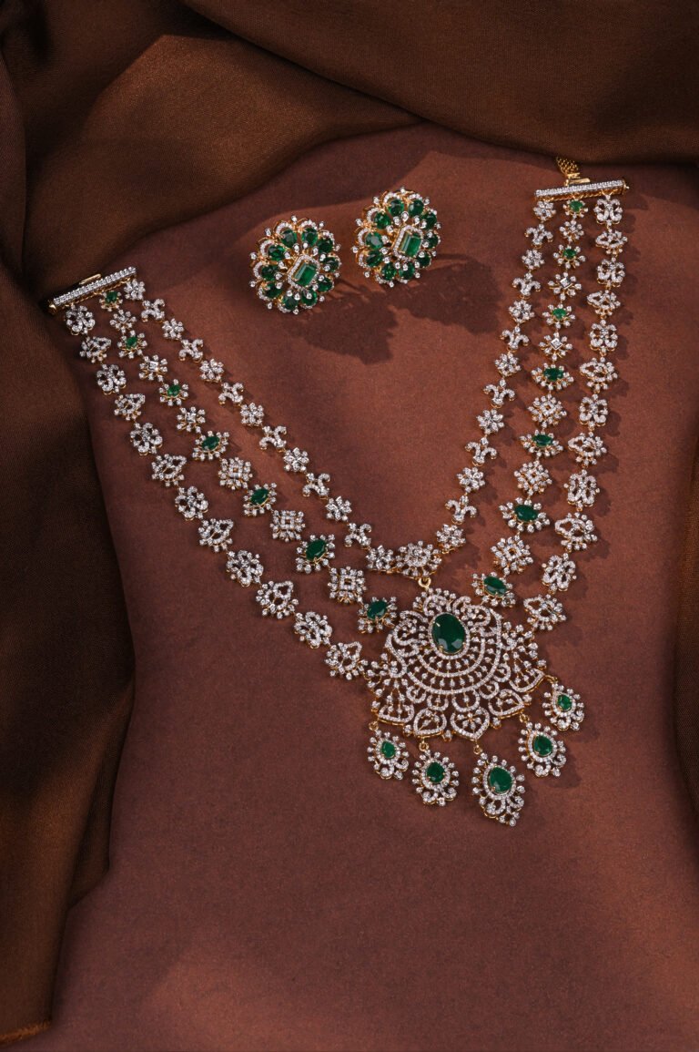 An opulent layered necklace adorned with shimmering diamonds and rich emerald stones. The elaborate central pendant and cascading motifs reflect fine craftsmanship, making it ideal for brides who desire a bold and luxurious statement.
