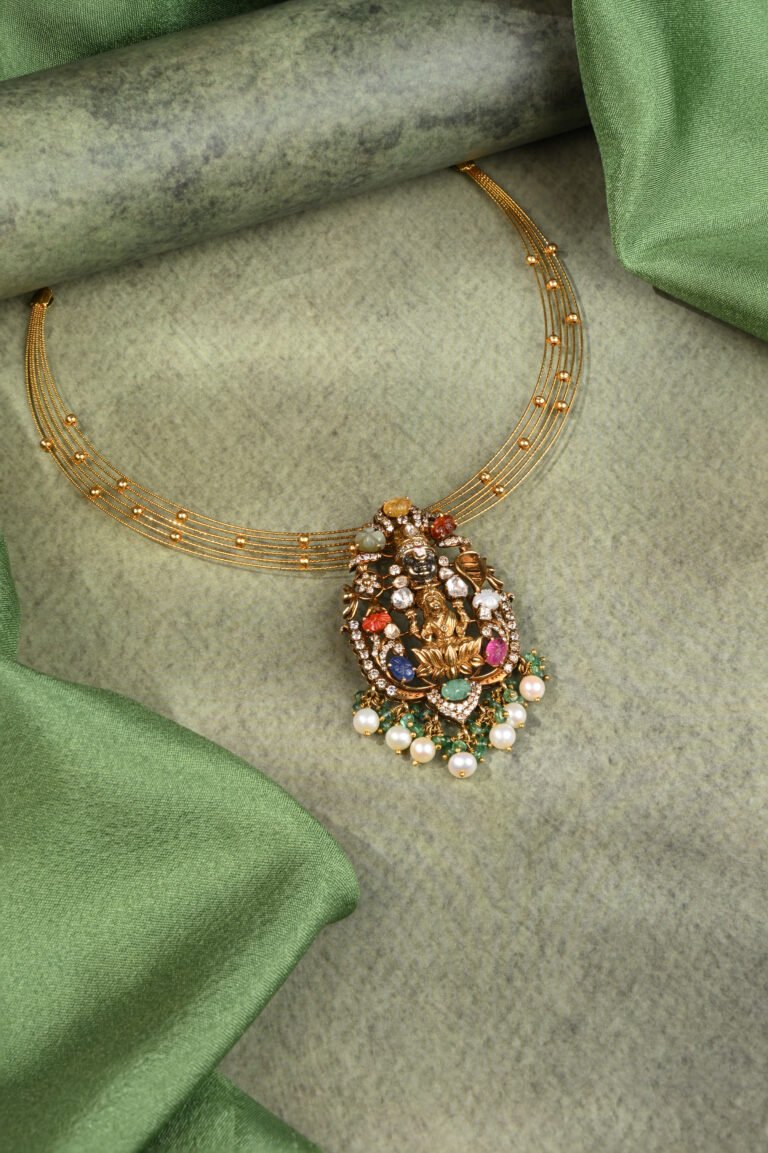 A divine polki necklace crafted with an intricately carved Lakshmi motif at the center, highlighted by traditional polki stones and delicate pearl drops. The multi-string gold finish adds elegance, making this piece perfect for weddings, temple ceremonies, and grand festive occasions.