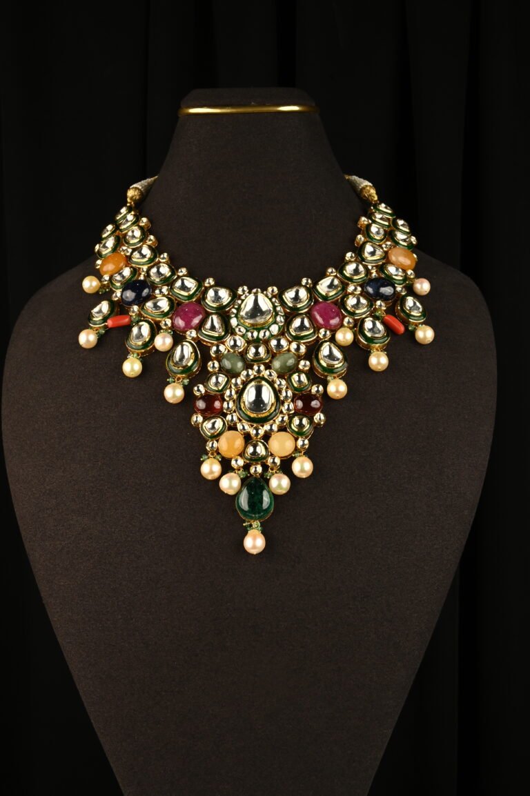 A striking Kundan choker featuring multicolored stone accents inspired by navratna traditions, finished with pearl drops for added elegance. This statement piece blends spiritual symbolism with royal craftsmanship, perfect for festive and ceremonial wear.