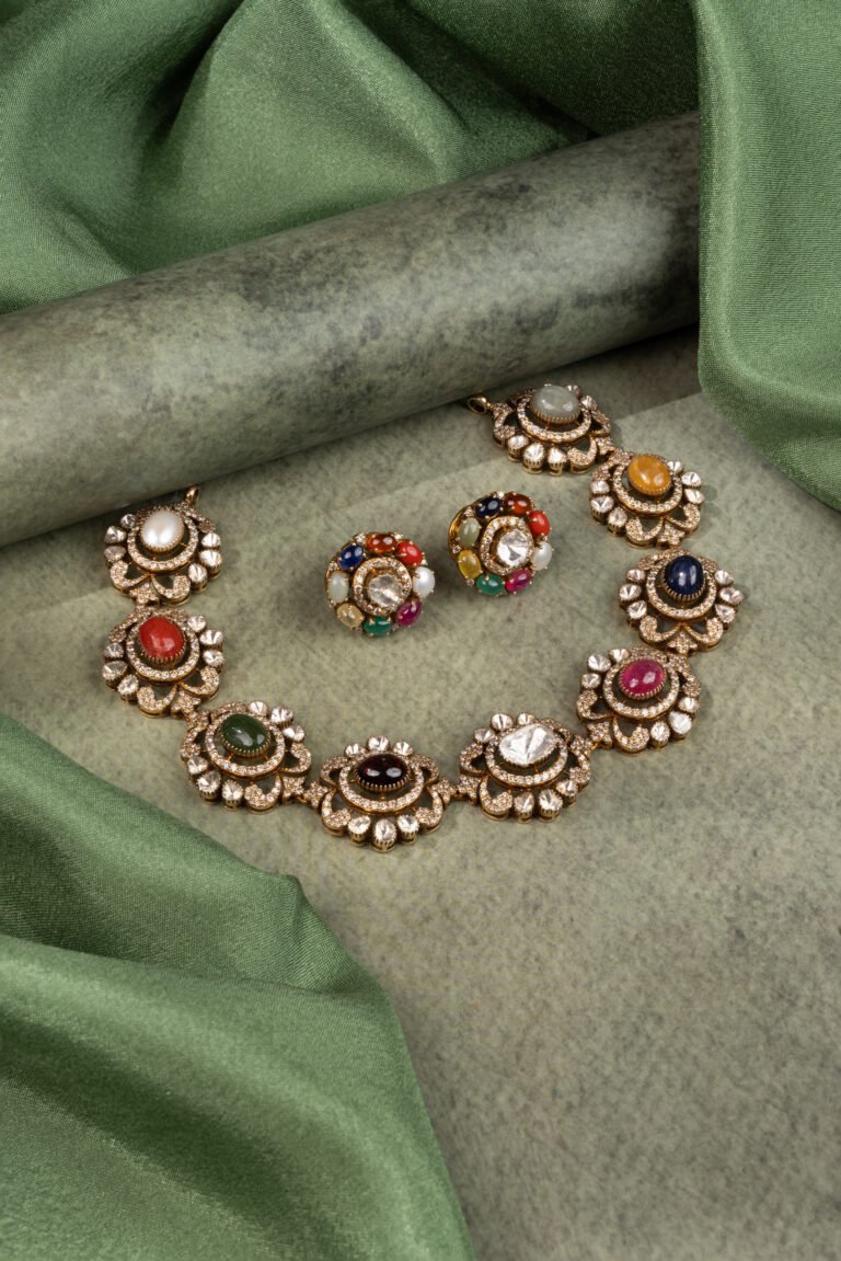 A vibrant celebration of color and culture, this Navratna Polki necklace is crafted with multiple gemstones symbolizing harmony and prosperity. Perfect for traditional ceremonies and statement styling.