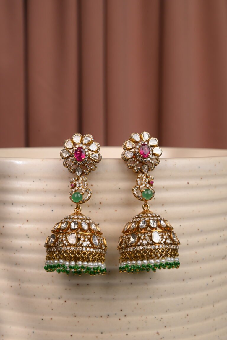 An exquisite blend of tradition and artistry. These Polki jhumka earrings are adorned with hand-set Polki stones and finished with pearl and green bead detailing, making them a stunning choice for weddings and festive occasions.