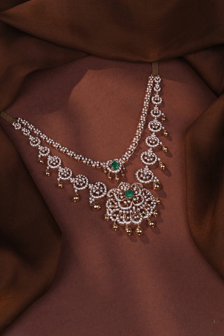 A majestic bridal necklace crafted in gold, featuring intricate diamond detailing with striking emerald highlights. The ornate centerpiece and delicate hanging gold drops create a regal silhouette, perfect for grand weddings and royal celebrations.
