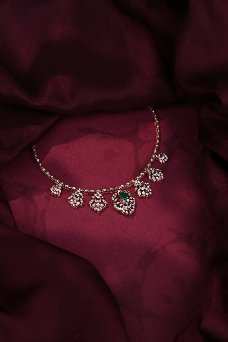 Designed for classic elegance, this necklace set features intricate diamond detailing with beautifully arranged emerald drops. The balanced design adds richness without overpowering your look, making it perfect for weddings, receptions, and traditional festivities. Comes with matching earrings for a complete royal finish.